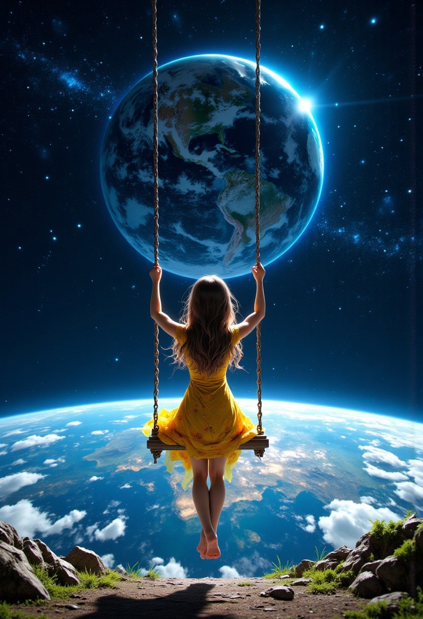 In the background, our Earth is visible with its charming curved contours. Light blue and white areas on the planet's surface indicate clouds and oceans, creating a picturesque picture of life on our home planet. In the center of the stage is a young girl with long wavy hair. She is sitting on a swing, looking straight ahead, and her legs rise to infinity, as if she is striving for the stars. The girl is dressed in a frivolous bright yellow dress with a floral pattern. The swing is attached by two invisible chains to the ground, creating a feeling of magic and unreality. The girl's chains and dress shine in the light, adding radiance and smoothness to the composition. Above the Ground, space turns from deep blue to starry darkness, strewn with many white dots - stars. This creates a sense of the infinity and grandeur of the cosmos. Air particles add atmosphere and realism to the image, making it look like a scene from a movie or a visual novel. The scene is filled with dynamics and emotionality, as if fixed in a moment of joy and wonderful discovery. The textures are smooth and shiny, creating a feeling of perfection and beauty. The color palette is bright and saturated, which makes the image memorable and inspiring.