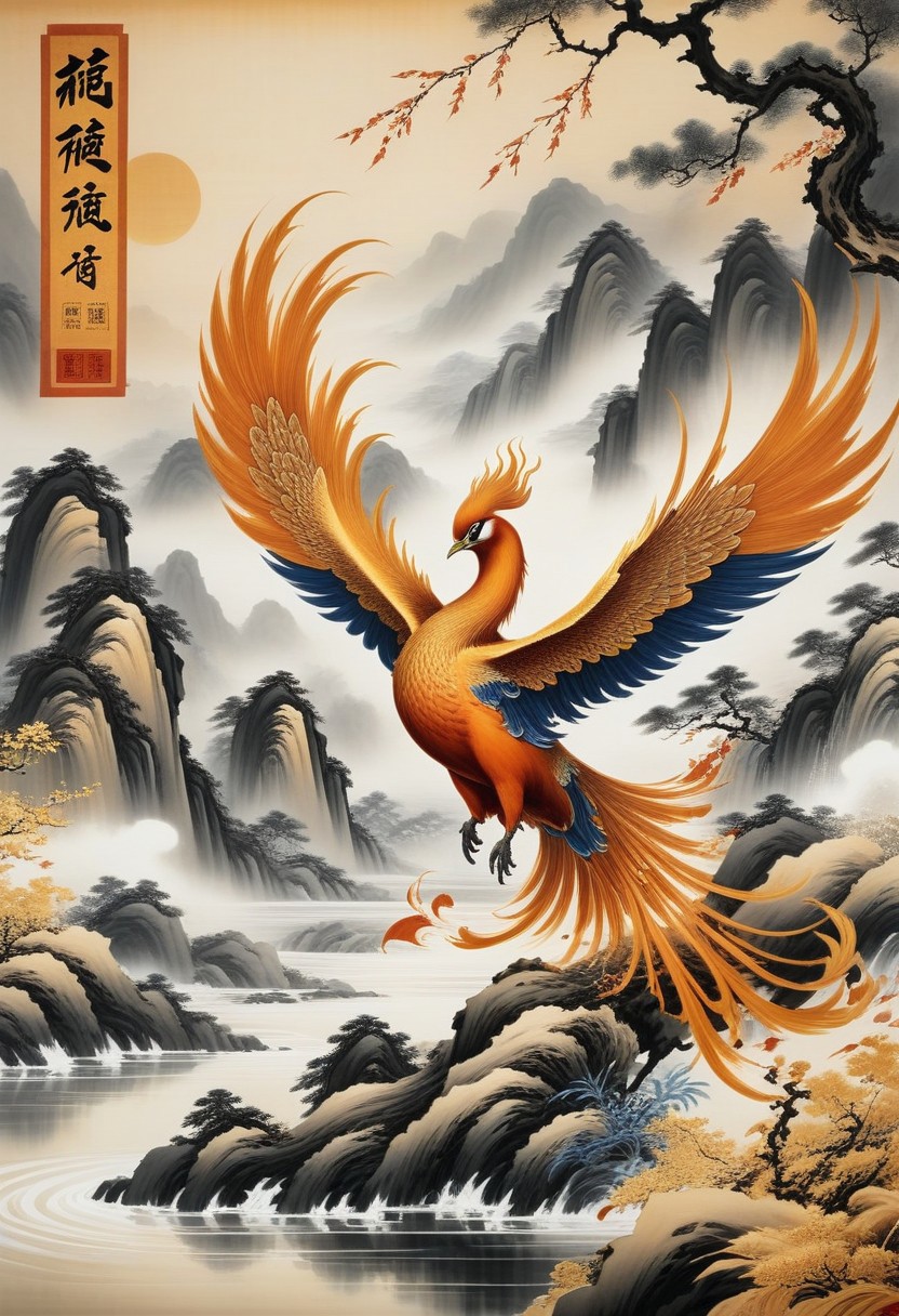 phoenix in Sinoink style, detailed, hyperrealistic, masterpiece, magazine advertisement,8K wallpaper,