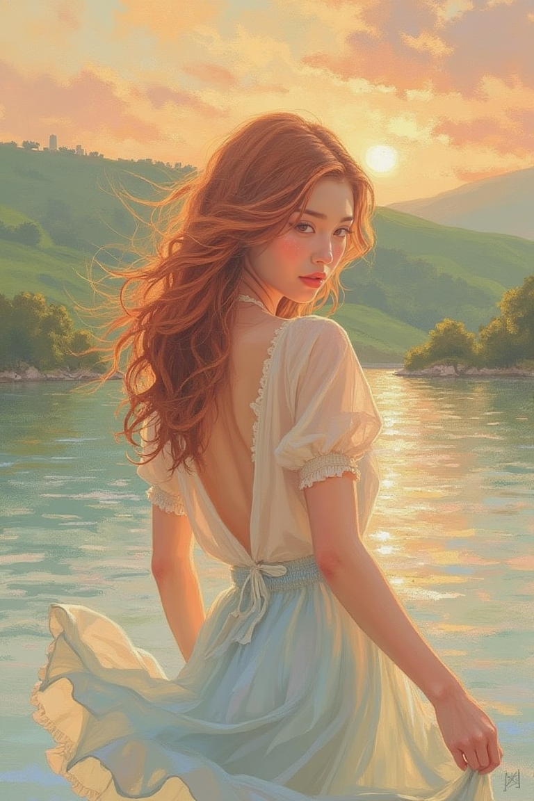 A serene woman stands at the edge of a sparkling lake at sunset, her auburn hair flowing gently in the breeze. She wears a soft, cream-colored blouse paired with a light blue, frilly skirt that moves delicately with the wind. Her pose is relaxed yet elegant, with one hand resting lightly on her hip and the other brushing against her skirt as she gazes over the water. Rolling green hills stretch into the distance, dotted with clusters of trees, while the lake reflects the warm orange and pink hues of the sky. The illustration is semi-realistic, emphasizing soft textures, warm tones, and the tranquil beauty of the lakeside scene,Ar89,concept art
