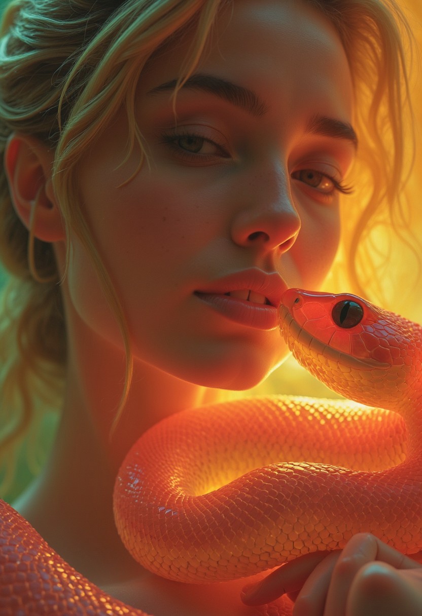 A close-up of Eva’s radiant face, her flawless skin glowing softly in the golden light of a serene garden. Her striking, expressive eyes gaze curiously at a translucent, laughing snake coiled gently around her shoulder. The snake's vibrant sss tones (beige-white-red with shimmering hints of turquoise and green) reflect the warm sunlight, its intricate scales glowing like precious gemstones. The apple it holds in its delicately arched mouth glistens with an inviting golden hue, creating a harmonious connection between them. Eva’s face is framed by cascading locks of hair and adorned with tiny flowers, adding to her ethereal beauty. The scene is intimate and uplifting, with soft cinematic haze, intricate details, and a sense of divine peace and wonder.