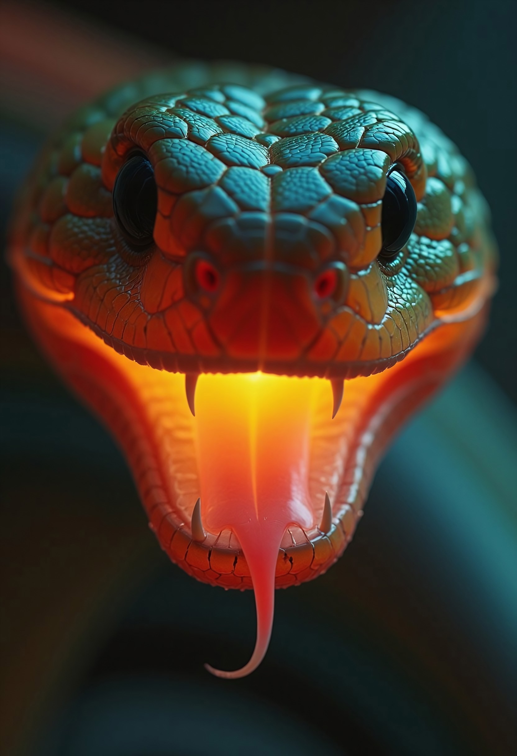 An extreme macro close-up of the translucent laughing snake’s head, capturing every detail of its intricate scales, lifelike texture, and vibrant neon sss tones of brown, olive, deep blue, and black. Its sharp, translucent teeth and detailed tongue gleam with moist realism, lit dramatically by a soft backlight that highlights the subsurface scattering. A shallow depth of field emphasizes the lifelike details, with a cinematic film grain adding a vintage touch. The translucent skin reveals a mesmerizing internal glow, creating an intimate and surreal portrait of the snake.