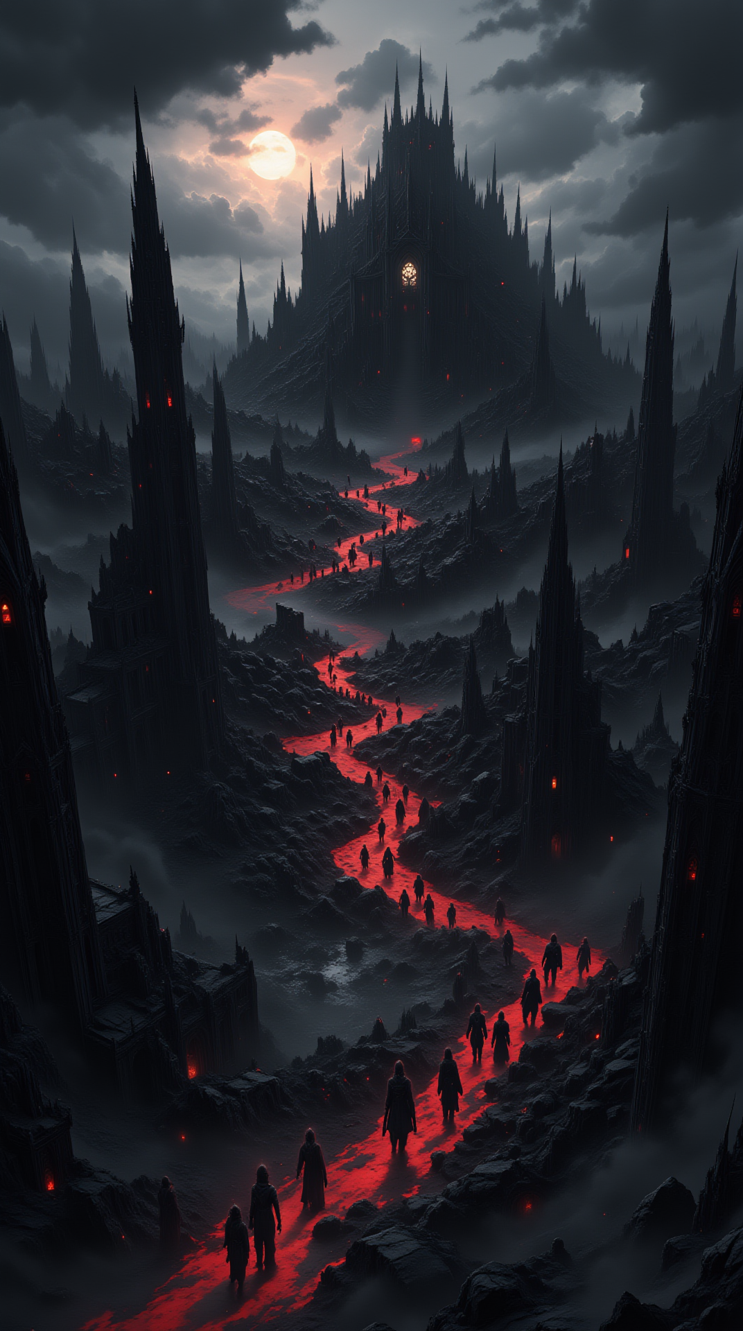 Once a thriving kingdom, now a desolate wasteland, shrouded in perpetual twilight. Black spires rise from the ruined city, their jagged forms piercing the overcast sky. The streets are eerily quiet, save for the occasional echo of distant footsteps. An army of undead soldiers marches through the remains of the kingdom, their hollow eyes glowing with malevolent intent. In the throne room, the corrupted king, now a twisted shadow of his former self, sits upon his throne, surrounded by dark magic that pulses with an unnatural rhythm. The kingdom is cursed, awaiting its final reckoning.