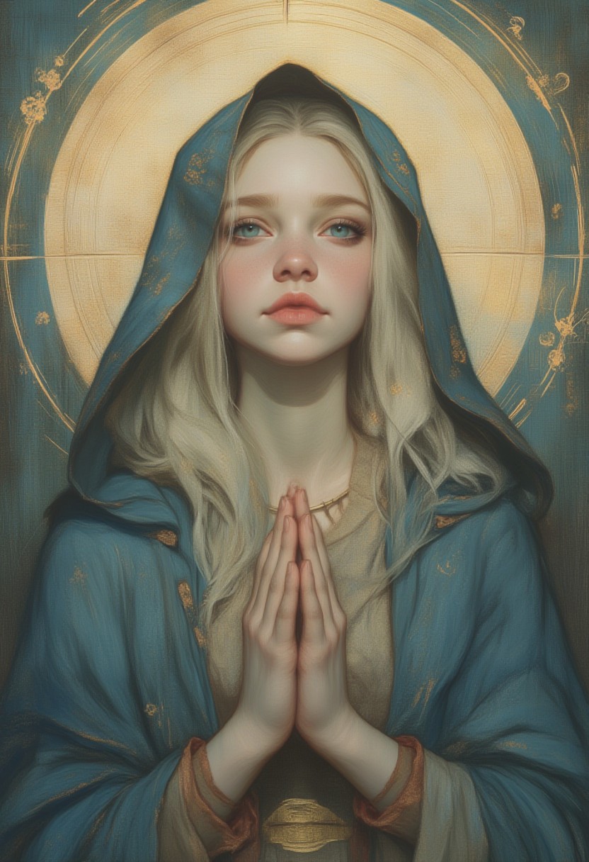 OBxiaoxiang, beauty, minimal moody portrait of 1girl, solo, 18 year old, virgin Mary, sky blue mantle, golden veil, ice blue eyes, medium blonde hair, long hair, pale skin, coy, small smile, blush, head to toe portrait, cute pose, coy, red lipstick, dramatic eye shadow, posing, divine, magic circle background, medium size tits, petite ,small hips, detailed eyes,), astral glowing aura, artistic, masterpiece, cinematic magic art dynamic pose, abstract expressionism mannerism, lights and shadows, glowing sparks,