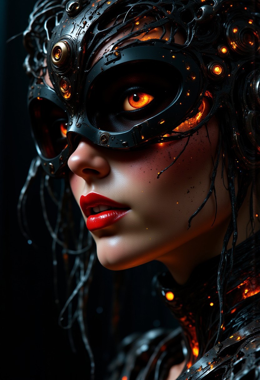 A sensual close-up portrait of Cyborg Cleopatra, her timeless beauty immersed in a dark, dystopian palette of deep black and faded red-orange hues. Her full lips, painted in a glossy, blood-red tone, glisten seductively, slightly parted to reveal their captivating softness. Her almond-shaped eyes are framed by dramatic black kohl lines, extended into bold, feline flicks, barely visible beneath a futuristic visor resembling a sleek, dystopian ski goggle. The visor is crafted from matte black alloy, its edges faintly glowing in desaturated orange, casting fragmented light across her honey-toned skin, now tinged with the ashen hues of a decaying world. Her high cheekbones glint faintly with a metallic bronze sheen, merging into intricate cybernetic implants embedded along her temples and jawline. The implants, etched with ancient hieroglyphic patterns, pulse with a faint, ember-like glow, their light flickering as if struggling to stay alive. Beneath the visor, traces of smoldering orange eyeshadow blend with her black kohl, creating a fiery yet muted contrast that echoes the dystopian atmosphere. Delicate, vein-like circuits etched in dark metal trace her face’s contours, glowing dimly in molten orange as they harmonize with her natural beauty. The background fades into shadowy black, with only faint, diffuse orange light illuminating her regal features.