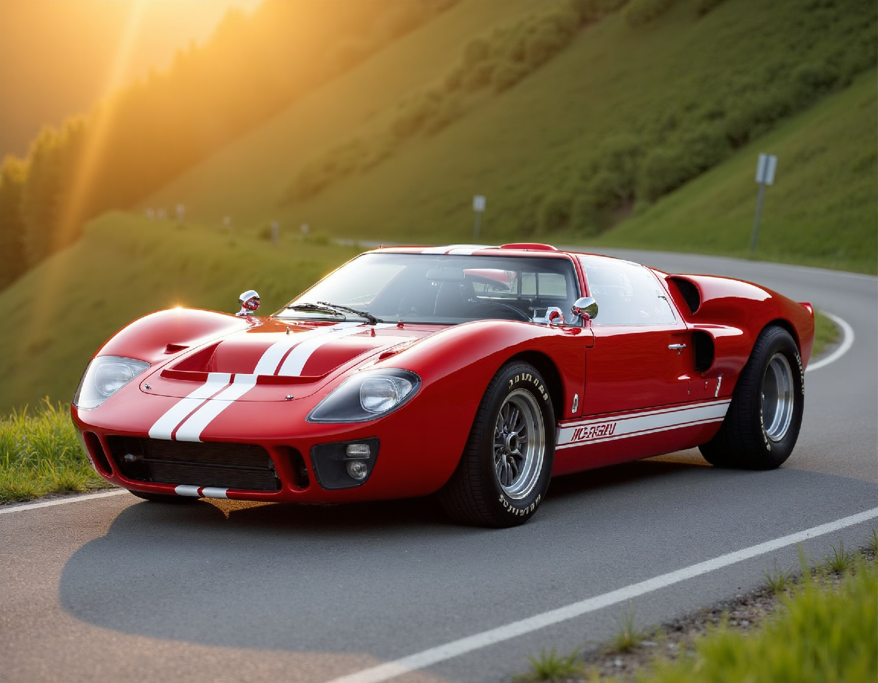 GT40_MKII Vehicle, A sleek, vibrant red 1967 Ford GT40 MKII, bathed in golden afternoon sunlight. The car sits poised on a winding asphalt road, surrounded by lush green hills. Capture the car's powerful curves and aggressive stance, emphasizing its iconic long hood and short tail. Render the details of the classic racing livery, with prominent sponsor logos and racing stripes. Focus on the car's aerodynamic design, highlighting its sculpted bodywork and prominent rear spoiler.
