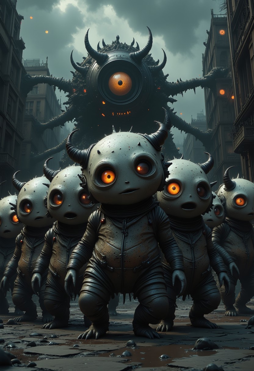 A strange and surreal scene unfolds, featuring a group of quirky, otherworldly creatures. Each creature has a large, single eye in the center of its face, surrounded by textured skin and small horns. Their bodies are round and bulbous, with tiny limbs and an almost childlike appearance, making them simultaneously unsettling and cute. The creatures stand in a formation, as if part of an odd procession, all facing forward with their wide, curious eyes. In the background, a twisted, mechanical structure rises, adding a sense of eerie dystopia to the scene. The atmosphere is dark and surreal, blending both whimsical and mysterious elements, creating a strange sense of intrigue.