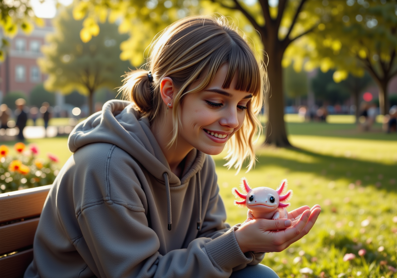 close-up shot of a young woman sitting on a park bench in casual attire: a baggy hoodie and jeans; her blonde ponytail and bangs frame her thoughtful face as she looks down at a tiny axolotl resting in her palm; the axolotl has soft, pink frilly gills, round black eyes, and a charming, goofy expression; the camera pans to capture her smile brightening as the axolotl wiggles slightly; warm sunlight streams through the trees, with a serene park backdrop of lush grass and vibrant flowers, evoking a sense of comfort and joy<lora:Axomodel_Flux_V2.safetensors:1.0:1.0> <lora:PCB_Image_Enhancer_for_FLUX.safetensors:0.5:0.5>