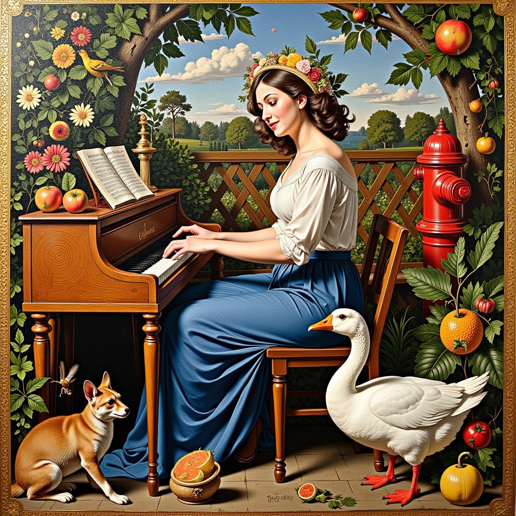 A Byzantine style mosaic showing a woman Elle playing her piano. She is sitting in the garden, surrounded by lattice fence, nature, flowers, birds, insects, small mammals, fruits and vegetables. The musical sound attracts small animals who approach in joy. A pure white goose sets at her feet admiring her music. There is a modern red fire hydrant visible in the background. Gold leaf style. Baroque oil painting by Caravaggio circa 1600.