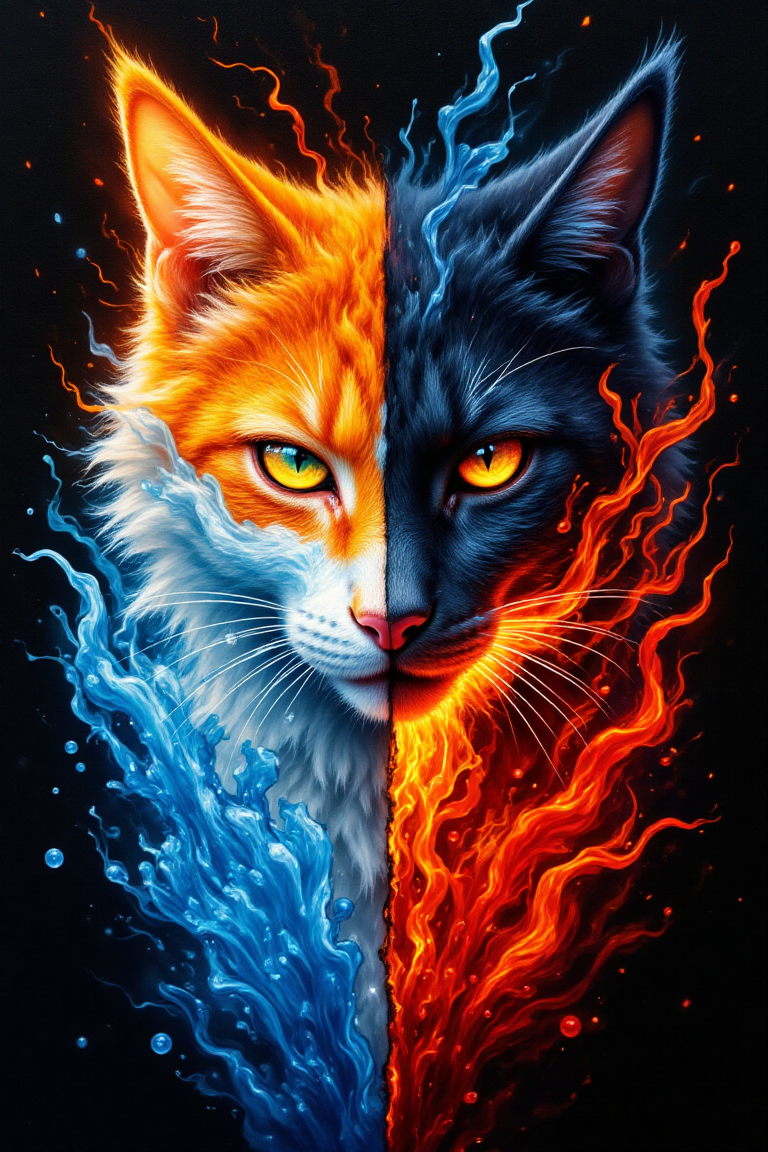 A painting of a cat split down the middle, one half engulfed in fiery red and orange flames, the other half in icy blue and white water. The cat's face is sharp and intense, its eyes glowing with reflected light. The style is dynamic and abstract, with visible brushstrokes and a splash-paint effect. The colors are highly saturated and contrasted. The background is black, allowing the cat's fiery and icy halves to stand out dramatically. The overall feel is powerful and mythical, suggesting a duality of nature. Title: Fire and Ice Feline . aidmafluxpro1.1