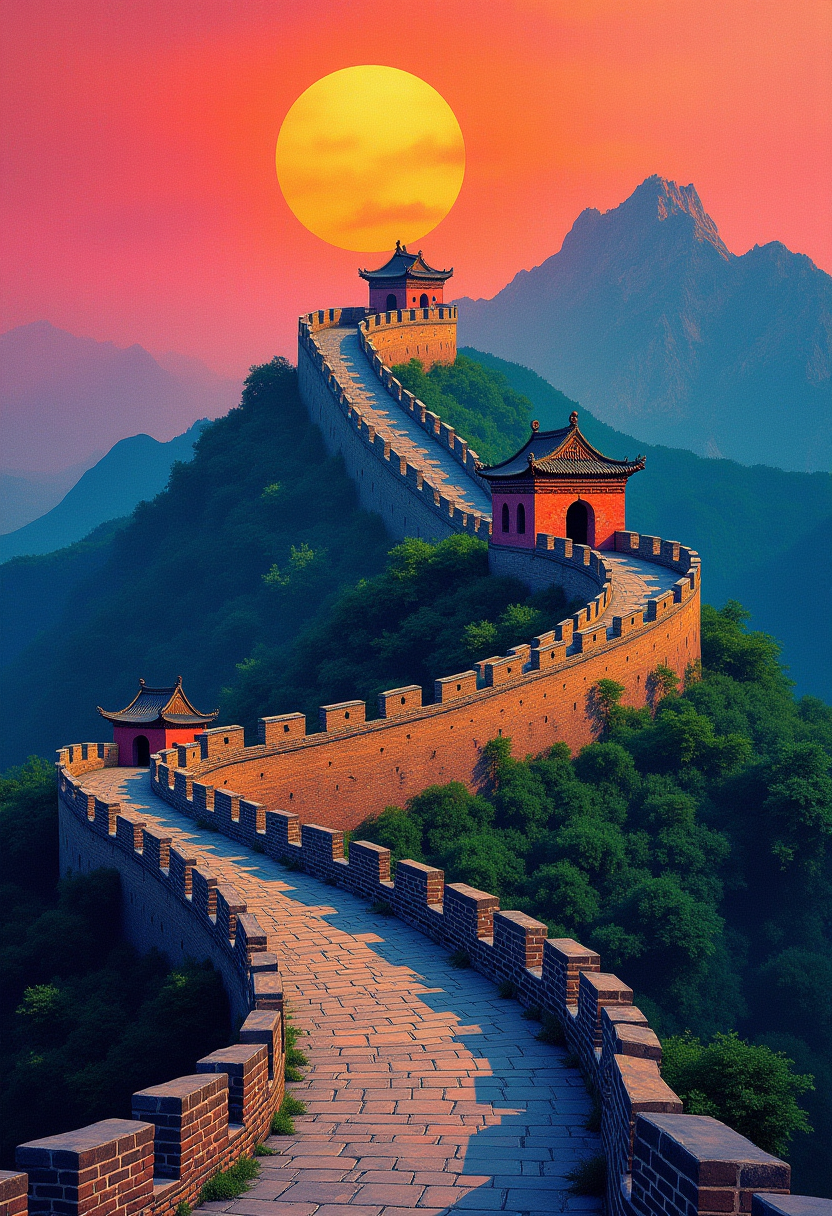 art by Kyffin Williams, engraving drawing, Asemblage art of Great wall of China, rich vivid colors, dramatic, very, cool colors, enchanted, epic, aesthetic, vivid colors, highly enhanced, excellent composition, dynamic background, very inspirational