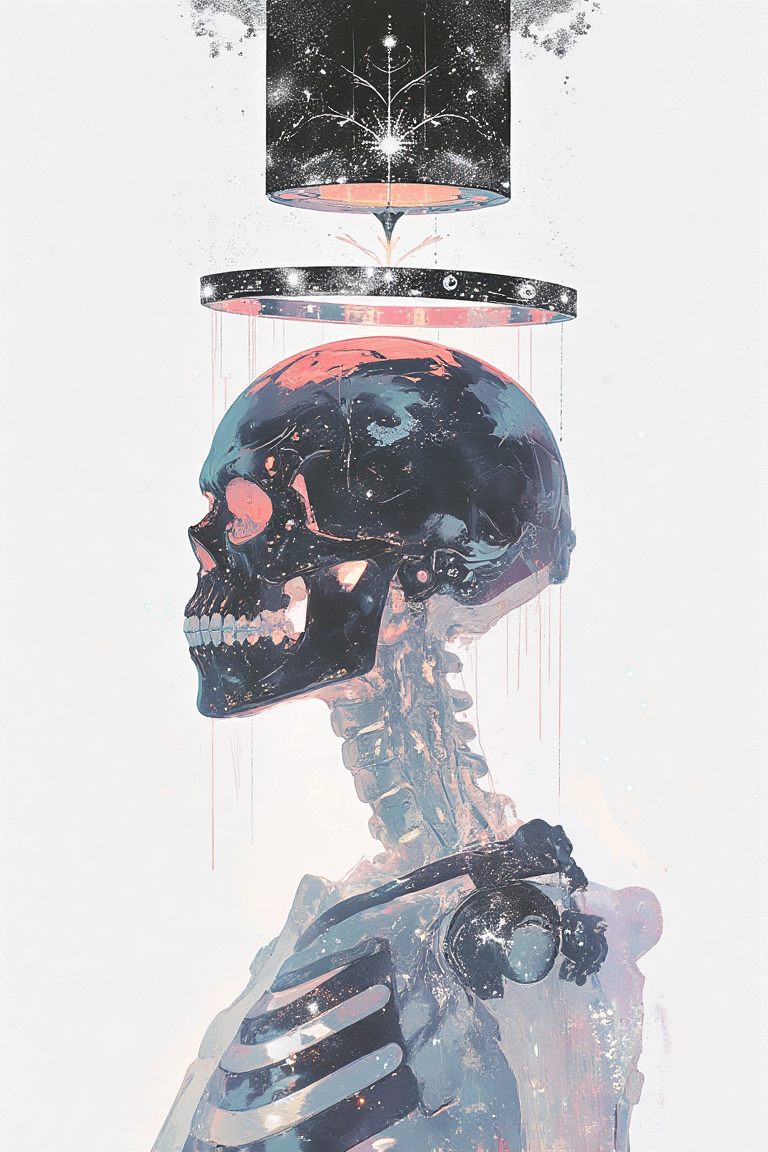 A digital artwork featuring a hyper-stylized depiction of a human skeleton in side profile, viewed from the left, with its bones rendered in pure chrome silver, gleaming with a mirror-like sheen that reflects light in dazzling highlights. The skeleton is intricately adorned with sparkling rhinestones covering its entire surface, adding a radiant, jewel-like brilliance to its metallic form. Intricate line work and meticulous shading enhance the three-dimensional appearance, blending anatomical precision with artistic abstraction. Positioned along the left vertical third of the composition, the skeleton adheres to the rule of thirds, achieving a harmonious and dynamic balance. Above its head, a surreal, asymmetrical halo in bold black patterns floats, its intricate design creating an enigmatic, otherworldly presence that contrasts sharply against the polished chrome of the skeleton. The background is a pristine white, amplifying the reflective and sparkling qualities of the skeleton and its rhinestone embellishments. The interplay of glossy silver, dazzling rhinestones, and the stark simplicity of the white background emphasizes the artwork’s futuristic and divine quality. The clean, sharp edges and stylized rendering bring a modern, high-impact aesthetic, focusing the viewer’s attention on the skeleton and its ethereal halo. HD, 8K quality, ultra-detailed, masterpiece artwork.