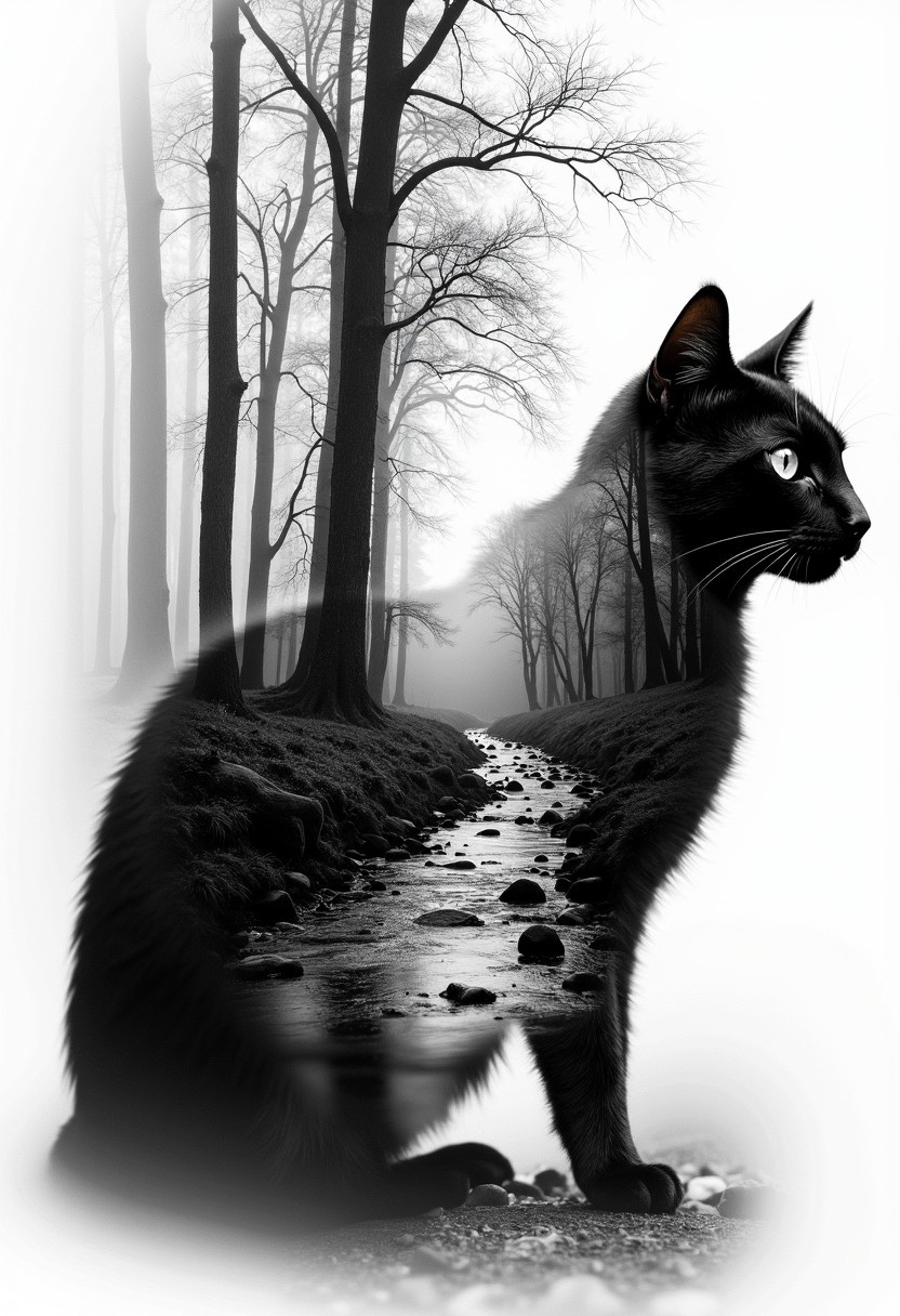 silhouette of a cat, wooded stream, double exposure, crisp lines, double exposure background, hyperdetailed, concept art, monochromatic, bo-exposure, double exposure,