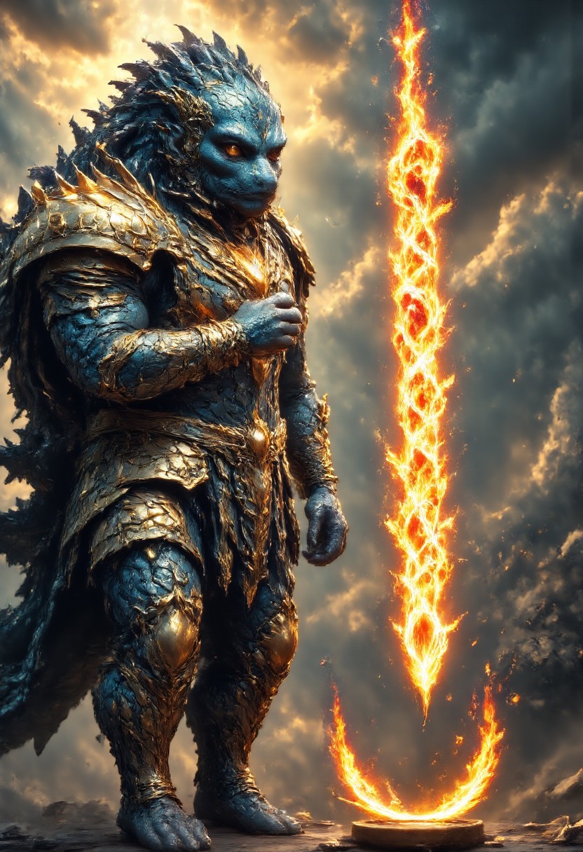 score_9, score_8_up, score_7_up, A Sea-Seprent paladin, Strong, Muscular, summoning a flaming celestial spear, ( floating in the air:1.1), which is dripping flaming aether.