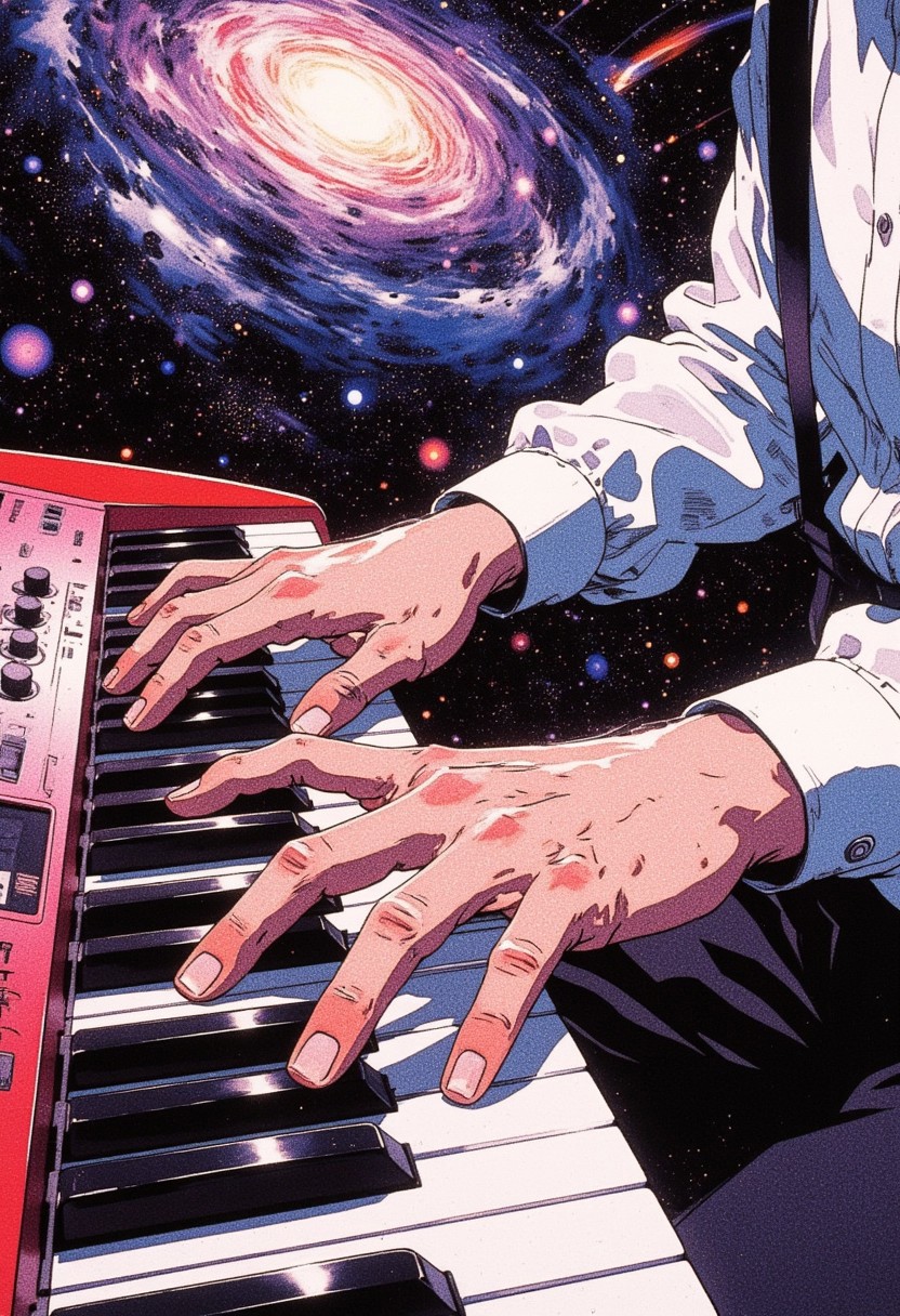 anime, A close-up of a pair of hands playing a keyboard, with fingers spread dynamically over the black and white keys, capturing the moment of musical performance. The hands are dressed in formal attire: a crisp white long-sleeved shirt with buttoned cuffs, and dark suspenders visible. The keyboard is modern, featuring a sleek red frame with subtle control panels and knobs visible on the left side. The background is transformed into a dark cosmic expanse, filled with swirling galaxies, shimmering stars, and nebulae in hues of deep purple, blue, and hints of glowing orange. The cosmic backdrop contrasts with the focused lighting on the hands and keyboard, creating a surreal and dramatic atmosphere. The scene blends the passion of music with the vast, infinite beauty of the universe.