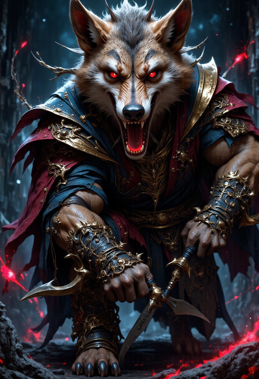 A 3D render of the "Idiot Wolf," a humorous yet dangerous fantasy game character. The anthropomorphic wolf has sharp, sinister features with glowing red eyes. Clad in light pattern assassin robes and wielding deadly curved blades etched with mystical symbols, the Idiot Wolf exudes a sense of humor through his funny posture and wicked grin. The minimal and shadowy background enhances the character's dark and perilous nature, while the vibrant and dynamic illustration style accentuates the sinister details. The exaggerated proportions and bold lines convey a sense of movement and intensity, encapsulating the essence of this high-stakes, fantasy-themed game character, blending danger, mystery, and power.