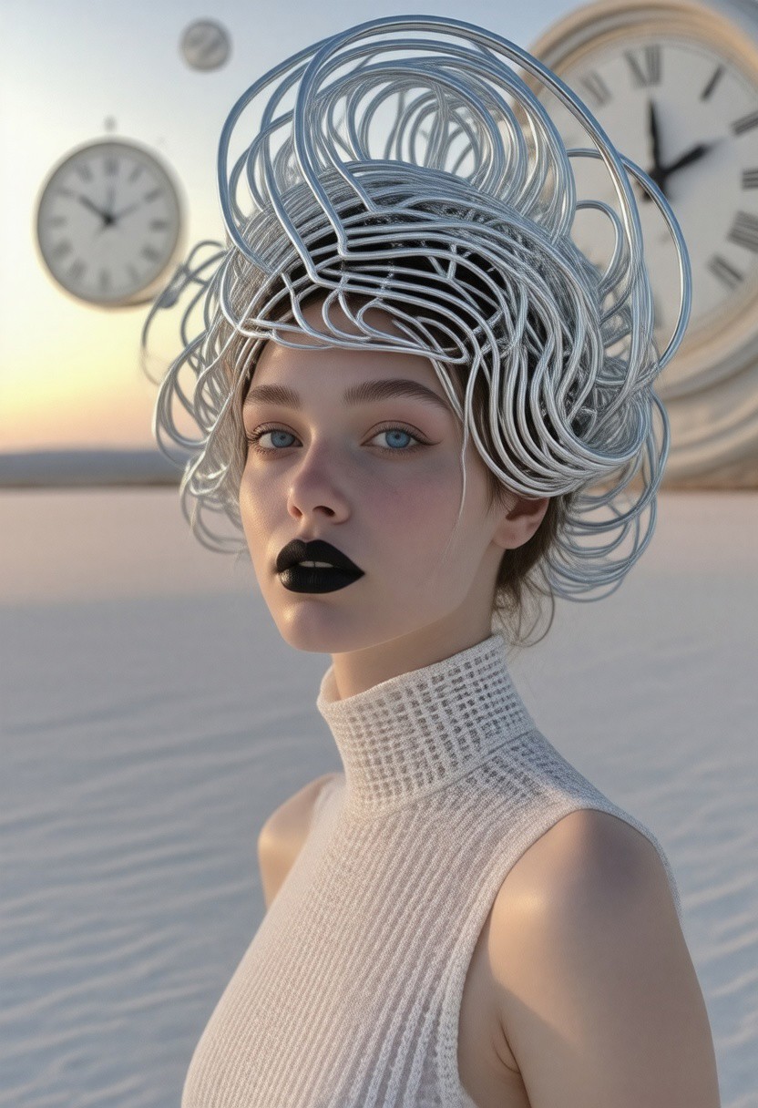 The model stands confidently, her head held high, showcasing a stunning chrome headdress of spiraling metal tubes, glowing against the soft, ethereal sunset. Her striking blue eyes, accented with geometric patterns, gaze directly at the viewer, contrasting sharply with her bold black lips. Surrounding her are surreal, melting clocks and gravity-defying furniture scattered across an expansive, monochromatic desert, creating an otherworldly atmosphere. woman turns around and laughs