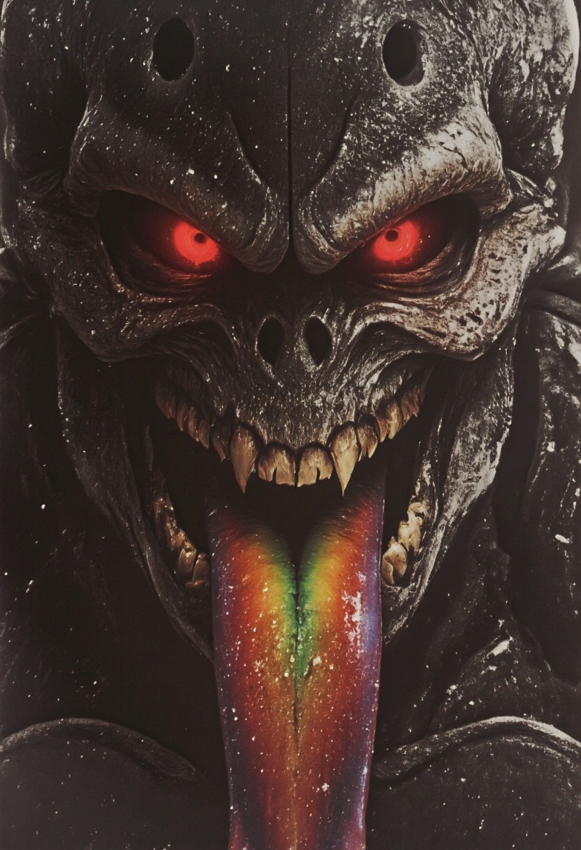 Extreme face closeup of a dark, menacing spawn in the heat of an intense, action-packed battle, captured with the gritty realism of an old analog camera. His piercing gaze is both haunting and resolute. The ethereal glow of his massive, twisted translucent tongue reflects in his eyes, crackling with dark energy that pulses ominously through the tongue. The rainbow-colored metallic sheen of His armor is faintly visible at the edges of the frame, hinting at its unique and alluring design. The intense glow from the tongue creates stark contrasts, illuminating her sharp features and casting dynamic, flickering shadows across her face. Jagged, twisted patterns etched into hus chainmail dress are barely visible, their ghastly visage seemingly alive, as the sinister light cuts through the battlefield’s hazy Steel sky.