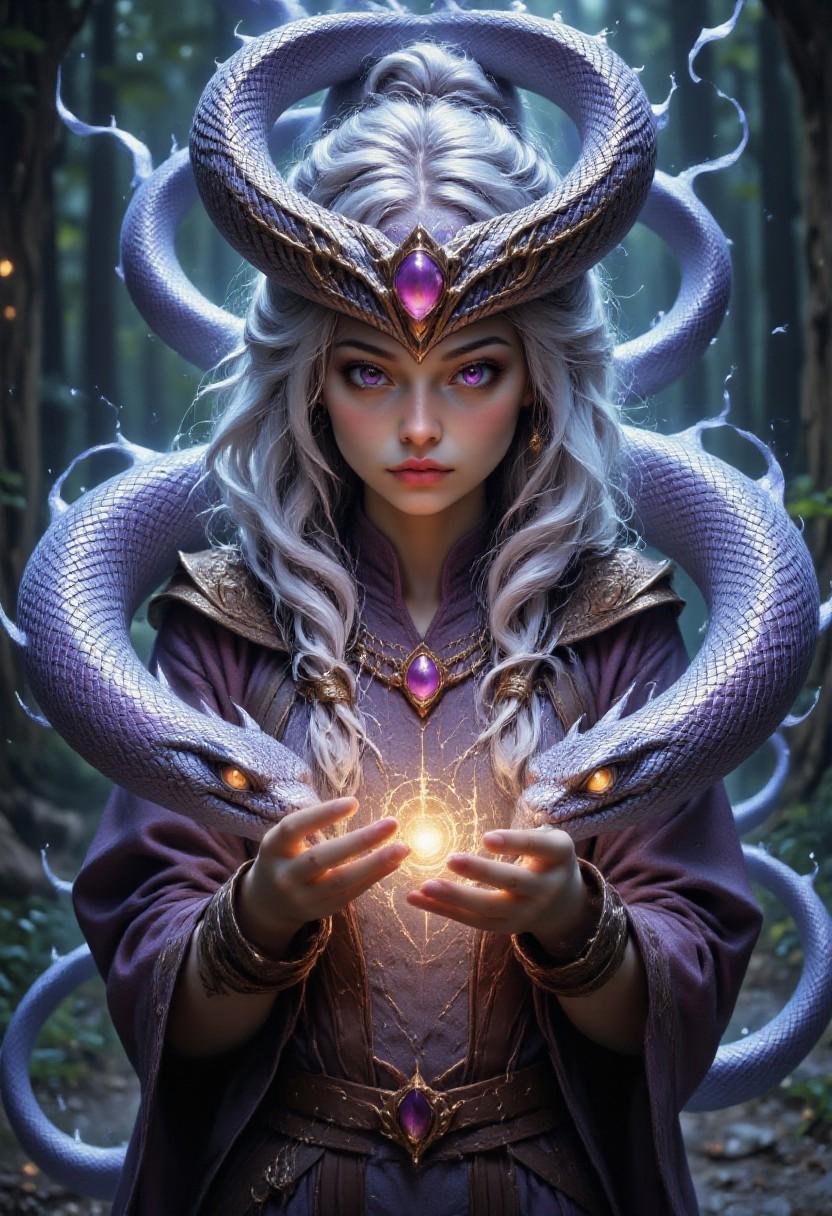 CynthiaPortrait, This digital art portrays a young Syndraa with white hair, sparkling glitter adorning her face and she is wearing an ornate headpiece that resembles a helmet with a purple gem in the middle. she has long hair and purple eyes. glowing eyes. she gazes at the metallic snake wrapped around her arms, face to face with it like two friends. metallic snake, metal snake. snake spell