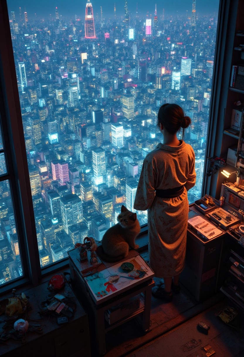 Jiji, the cat from Kiki's Delivery Service sits on a cluttered metal riveted desk next to a maneki neko statue and a small Nintendo NES, Jiji is looking out of a floor to ceiling window that looks out at a very high view from an apartment on the 400th floor of a futuristic Tokyo skyscraper, the year is 2250, The city has thousands of enormous wide and tall futuristic skyscrapers and space ships in the sky, (((Kiki from Kiki's Delivery Service, 24 years old, is standing next to the cat looking out at the enormous city at night, filled with buildings over a mile tall))), Kiki is dressed in an ornate Japanese style bath robe. The woman's hair is messy from just waking up and tied up with a ribbon. Artistic cyberpunk, dynamic perspective, The focus is on Jiji and Kiki standing together looking out the window at the view together,