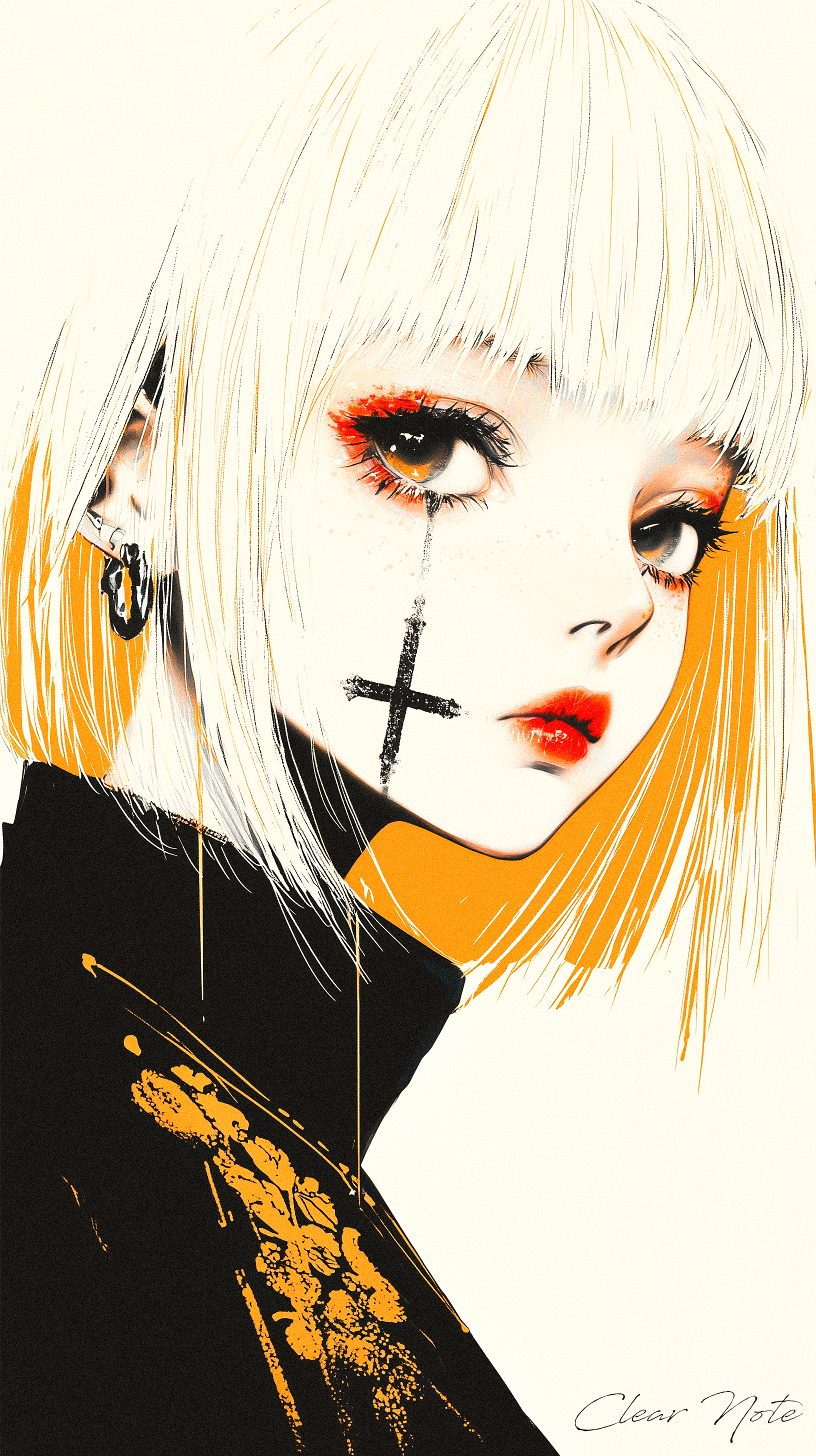Japanese anime art style, Pink pixie hair, a cross-marked face, Earrings gleam with a rebel's grace. In black, with blooms of yellow sewn, Her icy stare chills to the bone.