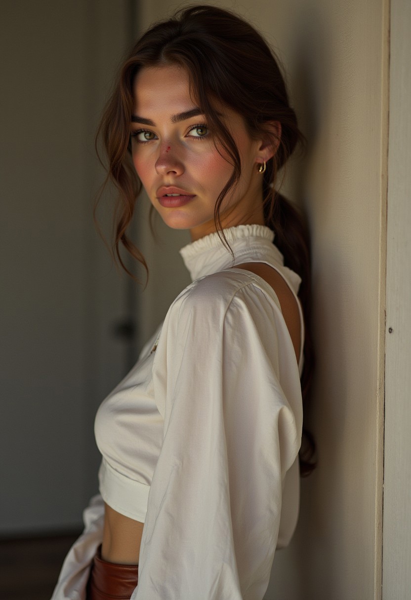 tall skinny supermodel looking softly at the viewer, fashionable clothing with a hint of innocence and grace
