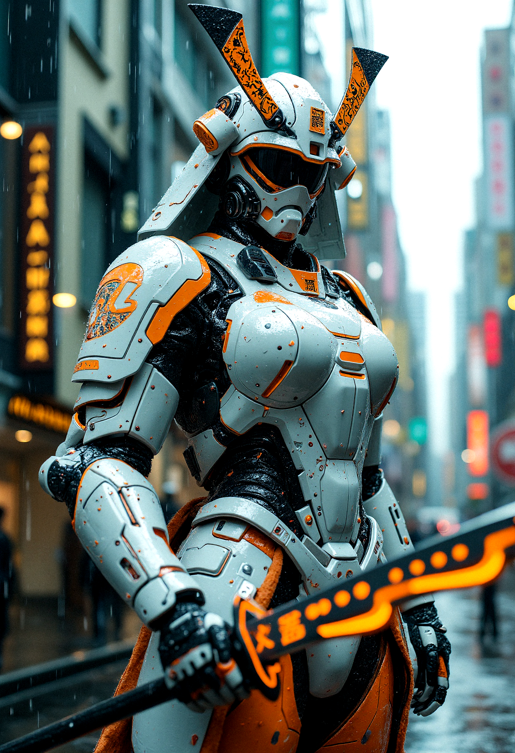 A hyper-detailed futuristic samurai-inspired mecha, clad in gleaming white armor accented with orange highlights and intricate black mechanical components. The design features exposed inner mechanisms, precision joints, and high-tech plating engraved with cryptic symbols. The mecha wields a sleek, cybernetic katana with glowing orange energy lines along its blade. Rain falls softly in a neon-lit cyberpunk cityscape, reflecting off the armor's pristine surfaces and adding a sense of drama to its poised stance.