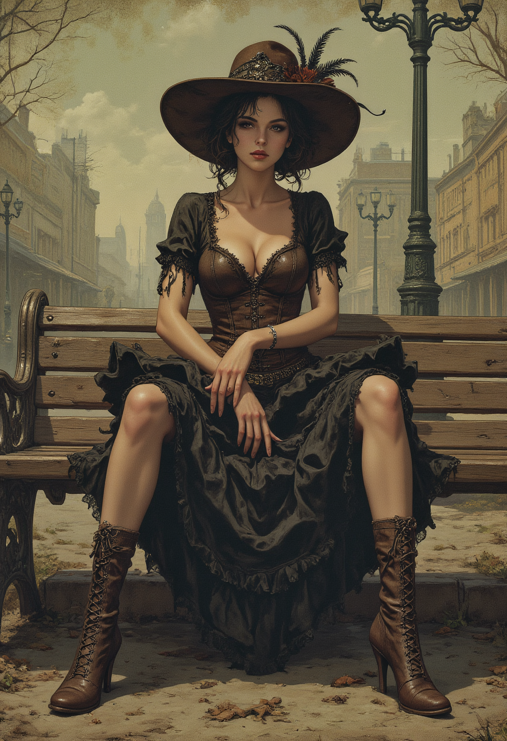 Illustration: Young, stylized female figure, circa teenage-early twenties, sitting on park bench. Black and white striped stockings, laced brown heeled boots, detailed steampunk aesthetic. Dark brown corset top, layered ruffled black lace skirt. Large ornate hat with feather accents and floral detail, resting on head. Intense, dramatic expression; large, dark eyes, slightly downturned lips. Smoking cigarette in hand. Detailed, textured clothing. Composition emphasizes figure from knees up; seated pose. Atmospheric perspective. Vintage, gothic, art nouveau style. Urban setting, with faded cityscape background; textured, sepia tones. Rustic park bench with intricate design; wood-like texture. Muted tones of brown, sepia, and dark gray, with subtle hints of pastel shades for atmosphere. Intricate details in drawing style of Alphonse Mucha. Dramatic lighting suggests a late afternoon scene. Detailed perspective and camera angle emphasize figure. Dark atmosphere; melancholic mood.