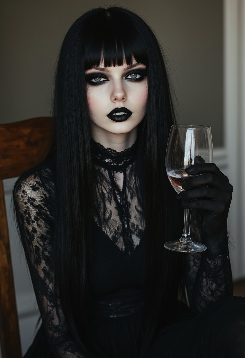 FictionalCrystal, goth girl with heavy black eye makeup and black lipstick. Wearing a detailed black dress, holding a wineglass. Vampire teeth