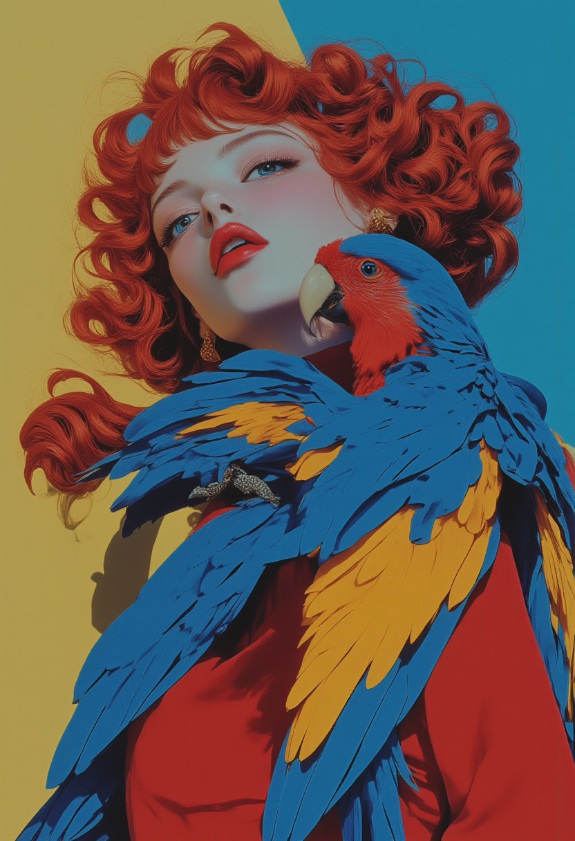 A surreal, digital painting featuring a young woman with pale skin and vibrant red curly hair styled in a vintage bob, her serene expression accentuated by striking light blue eyes. She wears a high-necked turtleneck sweater in radiant hues of red, blue, and yellow, mirroring the vivid plumage of the macaw perched gracefully on her arm. The macaw is rendered with exquisite detail, its feathers a mesmerizing blend of bright blue, fiery red, and sunny yellow, its curious gaze and slightly open beak adding a sense of liveliness. The background is a gradient that seamlessly transitions through the macaw's vibrant colors—deep blues, bold reds, and glowing yellows—creating a harmonious and ethereal atmosphere. The painting is hyper-realistic, with a subtle touch of fantasy, blending intricate textures and lifelike details with an imaginative interplay of colors. Soft gradients and expert use of light and shadow enhance the smooth, painterly quality of the artwork. The composition exudes calm introspection, where the woman and the macaw share a tranquil moment, evoking wonder and serenity in a captivatingly vibrant yet harmonious scene. (vintagegirls)