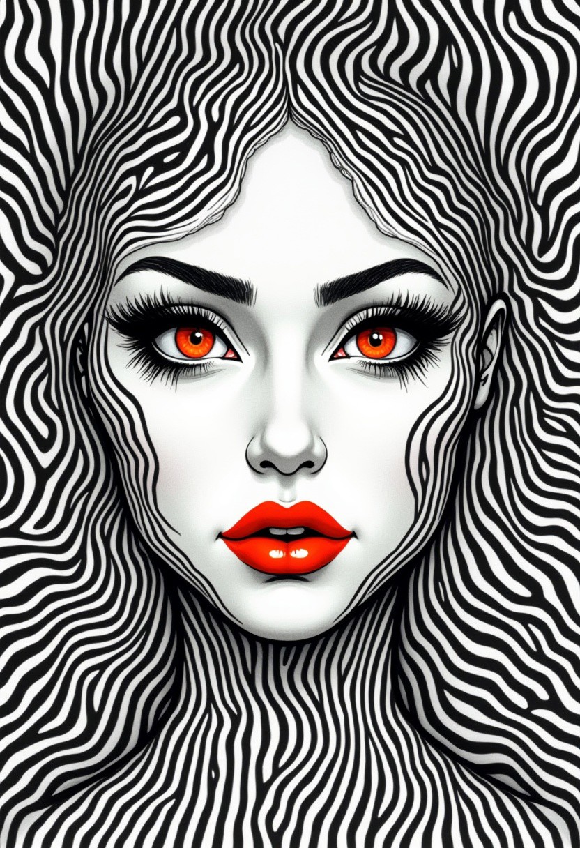 Facial portrait. Optical illusion. Strong black and white swirling pattern on face. Within a stark black and white 4K frame, a captivating flat illustration unfolds. A woman's porcelain-like visage is adorned with delicate, vibrant black and white stripes that seem to ripple like the surface of water. Her large lips, a bold neon orange, pop against the monochromatic backdrop, evoking a hypnotic sense of unease. Twisted stripes writhe in the background, as if alive, imbuing the scene with an air of mystique. The subject's sleek, line-sketched features are rendered in pristine detail, her skin a canvas for subtle makeup that accentuates her Igor Morsi-inspired style.