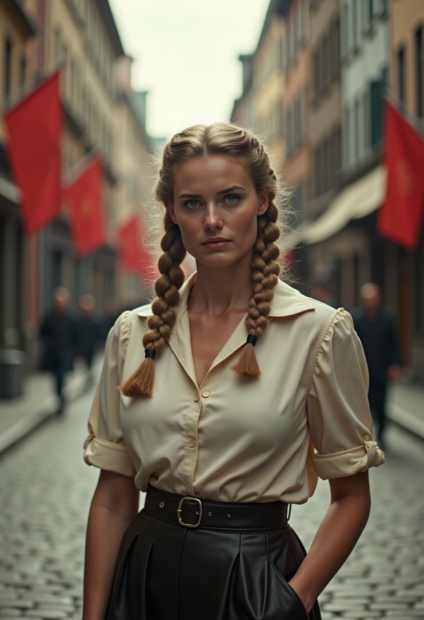 A full-body color photograph of a buxom German woman standing on a cobblestone street in 1940s Berlin, her traditionally braided blonde hair framing a sad yet proud expression. She wears a tight blouse that accentuates her figure, including her ample bust, while her natural skin texture and detailed face convey resilience. The hot summer day is palpable, with soft cinematic light casting subtle shadows and dim, faded colors evoking the era's somber atmosphere. Red flags are faintly visible in the blurred background, adding historical context without detracting from the subject. Captured with a 24mm lens, the scene features 4K textures, intricate details, and a cinematic look. The composition balances sharp focus on the woman with a softly blurred urban backdrop, creating a sense of depth and realism. Post-processed in Adobe Lightroom and PhotoLab, the image boasts HDR effects, exposure blending, low contrast, and soothing tones. The dramatic lighting highlights her expression and figure, while hyper-detailed textures and muted colors enhance the emotional weight of the scene. A timeless, award-worthy portrayal of strength and vulnerability in 1940s Berlin