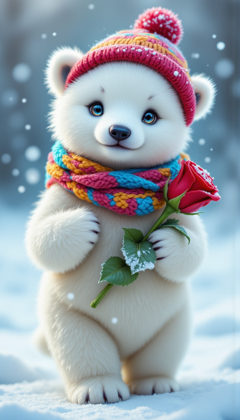 pinkfluxproultrafantasia, A playful and endearing polar bear cub, its fluffy white fur standing out against a snowy backdrop. It wears a cozy knit colorful cap and scarf, handcrafted with bright, cheerful colors to brave the winter chill. It's holding a red rose with snow on the petals. The bear's innocent eyes exude warmth and curiosity.