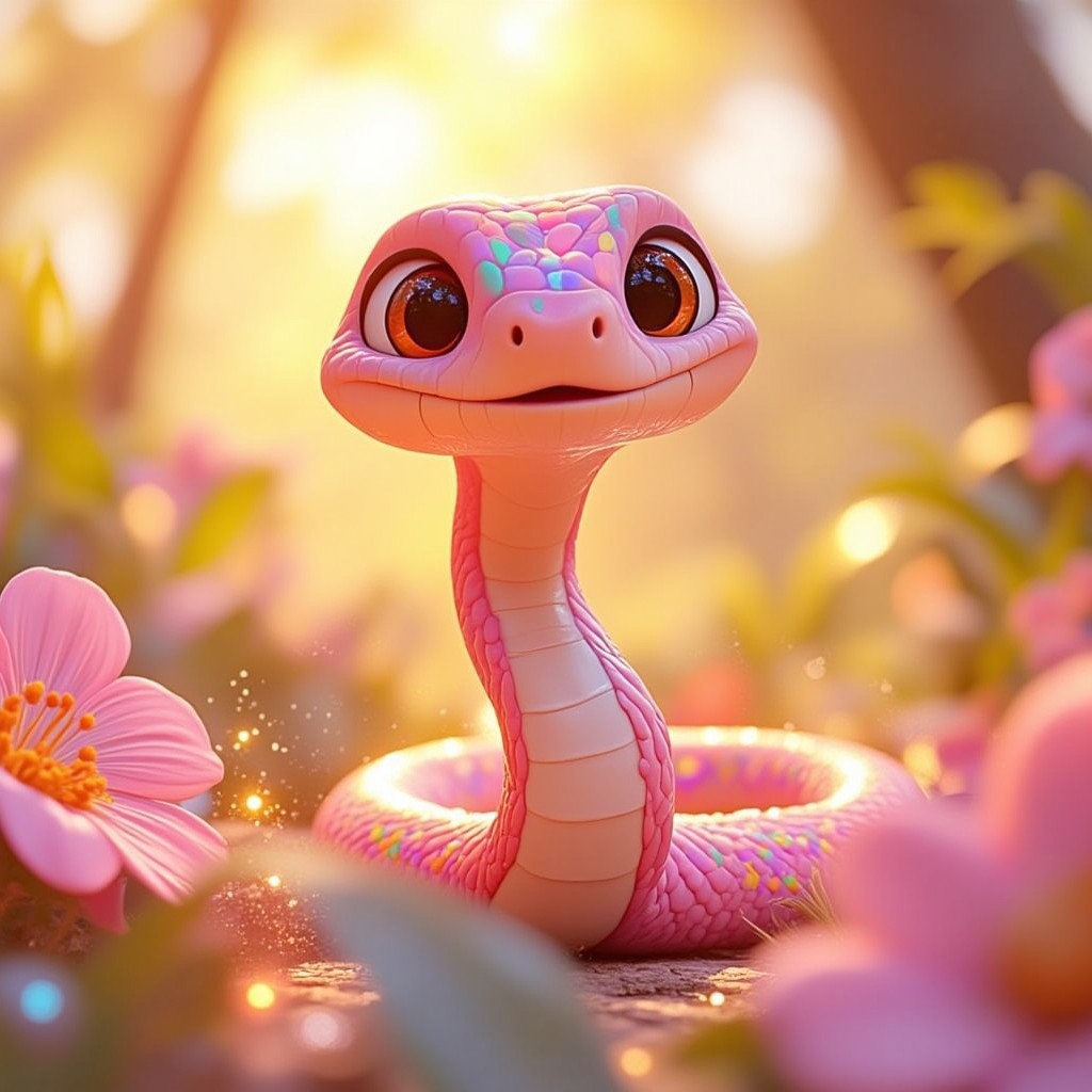 A fluffy, cartoonishly cute snake, with wide, expressive eyes and a perpetually surprised expression, slithers through a vibrant, colorful world that seems to have been pulled straight from a Pixar film. The snake's scales shimmer with a rainbow of pastel hues, and its tiny, delicate claws leave trails of sparkling dust as it navigates a whimsical landscape filled with oversized, bouncy flowers. Warm, golden sunlight streams through impossibly oversized, bioluminescent leaves, illuminating the scene with a joyful warmth. A gentle breeze carries the sweet scent of exotic, fruity blossoms, and the snake's tiny, playful chirps echo through the atmosphere, creating a lighthearted and energetic scene perfectly suited for a family-friendly animated movie.