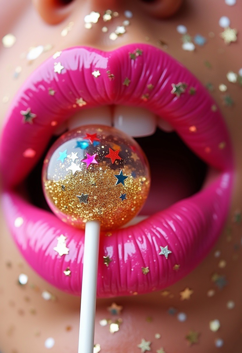 A close-up of vibrant pink glossy lips adorned with glittering golden and silver star-shaped sequins, giving a magical and festive look. The lips are holding a transparent lollipop that is filled with sparkling golden dust and colorful stars inside, creating a dreamy, ethereal effect. The overall composition is bright and dazzling, with a focus on rich textures and vivid colors, emphasizing the playful and enchanting atmosphere.