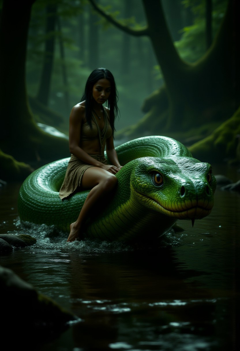 In a gloomy swamp, in the distance one female native warrior riding on the back of a humungous green snake, the snake is sidewinding through the water, the woman is sitting in a saddle near the snake's neck, correct digits, perfect expressive eyes, perfect pupils, otherworldly, interesting color pallet, Stunning visuals, Texture, beautiful face features, MurphFSF