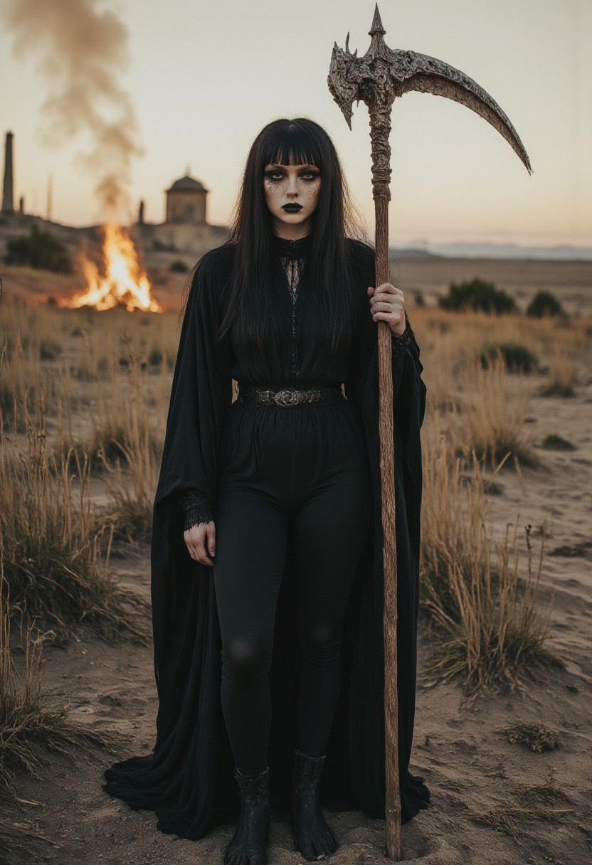 FictionalCrystal, a goth girl with heavy black eye makeup and black lipstick.Holding a large scythe and wearing a black robe. barefoot, in the grass with dead flowers, background of a burning city.CAICO