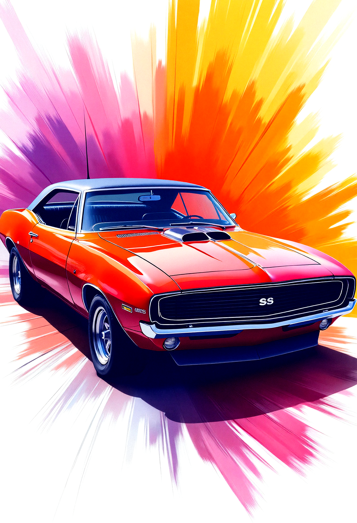 An artistic depiction of a retro muscle car in vibrant watercolor style, featuring dynamic splashes of bright orange, red, and purple. The paint appears to melt into the abstract, flowing background, where bold brushstrokes radiate outward. The car is intricately detailed with glossy highlights on its chrome accents and smooth curves, capturing a lively fusion of realism and impressionistic artistry.