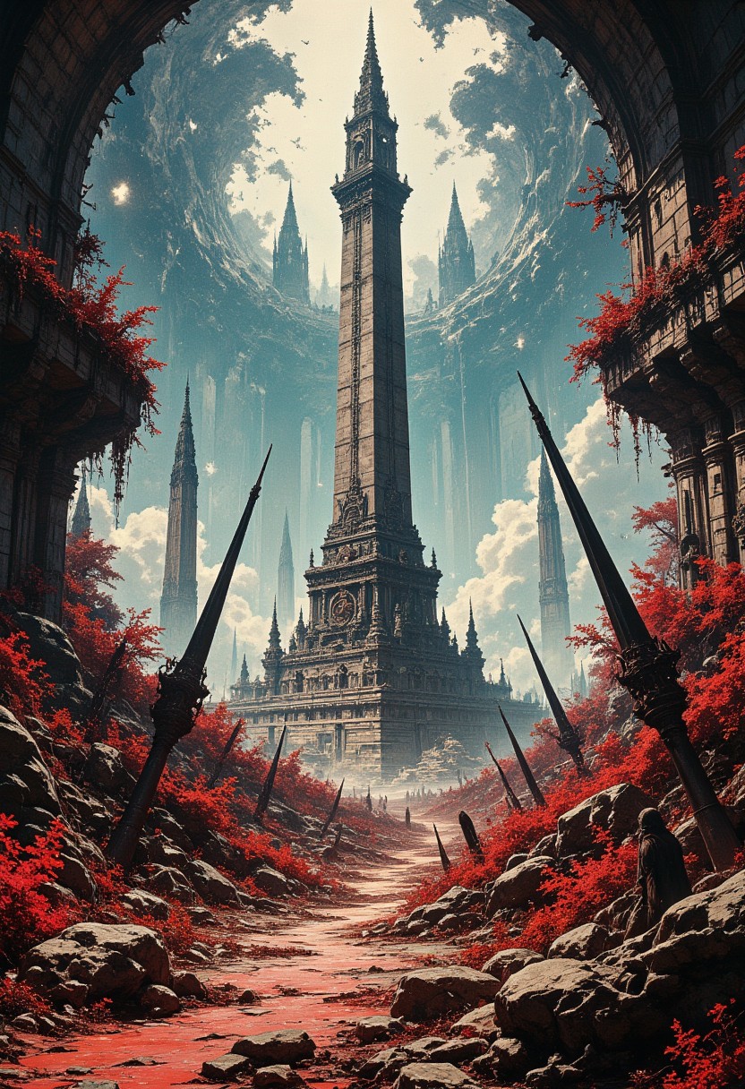 dark fantasy, gritty, an ancient battlefield frozen in time, where colossal, rusted weapons pierce the earth like forgotten monuments. The ground is scorched and cracked, glowing faintly with molten veins, while skeletal remains of soldiers are tangled in the roots of crimson, alien flora. Above, a fractured sky bleeds light through jagged rifts, casting surreal shadows that twist and move unnaturally. In the distance, a towering obelisk made of fused bones and metal emits an ominous hum, as spectral figures flicker and wail in its orbit—a grim reminder of a war that defied time and nature.