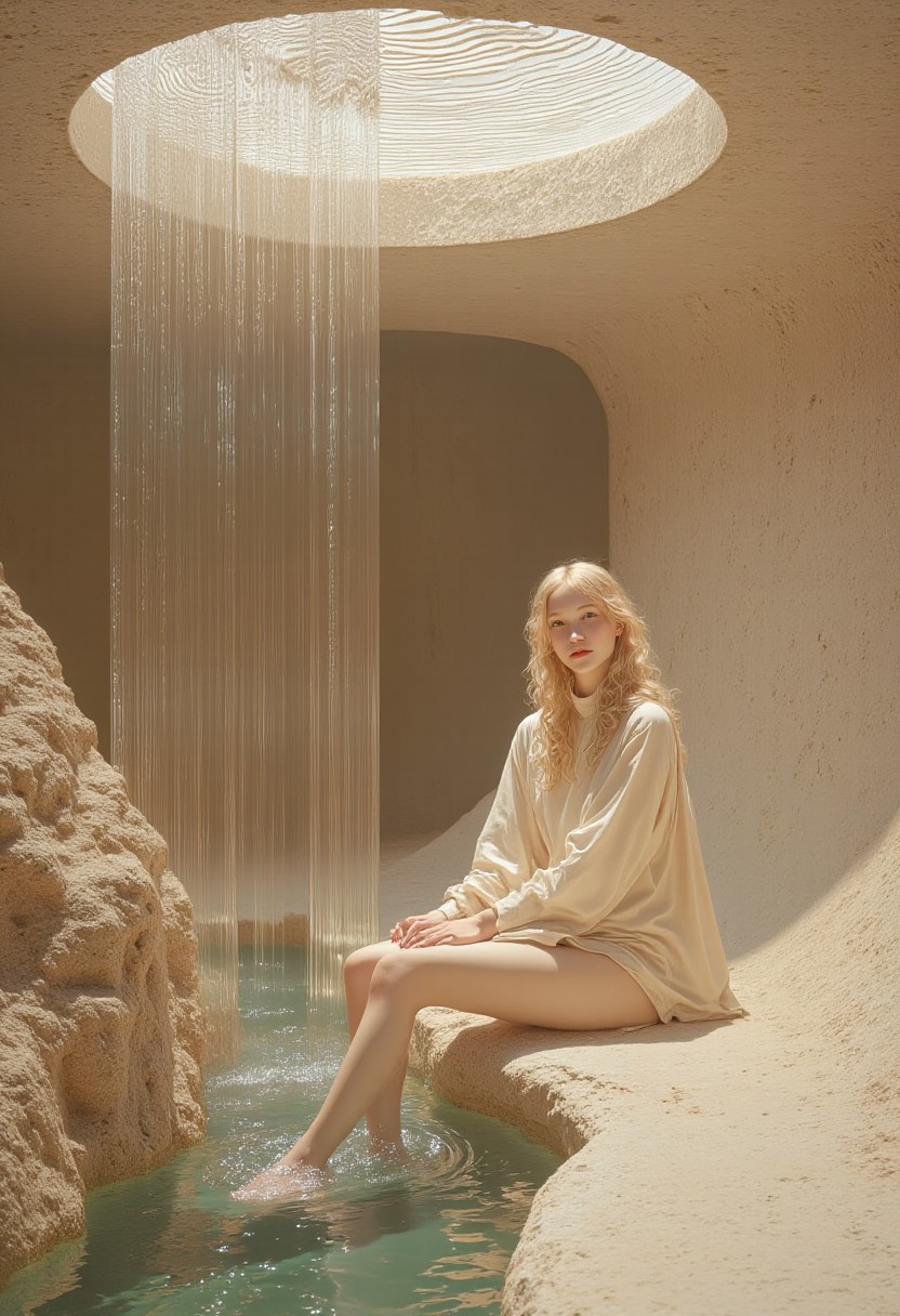 A hyper-realistic digital portrait of a tall woman with pale skin and long, flowing blonde hair styled in loose, natural waves. She wears a flowing cream dress from Jil Sander, its minimalist design emphasized by subtle draping and a high neckline. The room has a raw aesthetic with textured plaster walls and a light oak floor, softened by the inclusion of a large, abstract indoor water feature resembling a natural stream. She sits barefoot on the edge of the stream, her legs folded under her in a relaxed yet poised manner, her fingers trailing in the water. The dynamic pose captures both serenity and expression. Bright sunlight filters in through a skylight above, reflecting off the water and casting soft, rippling patterns across the walls, blending the indoor space with the feeling of an outdoor oasis.