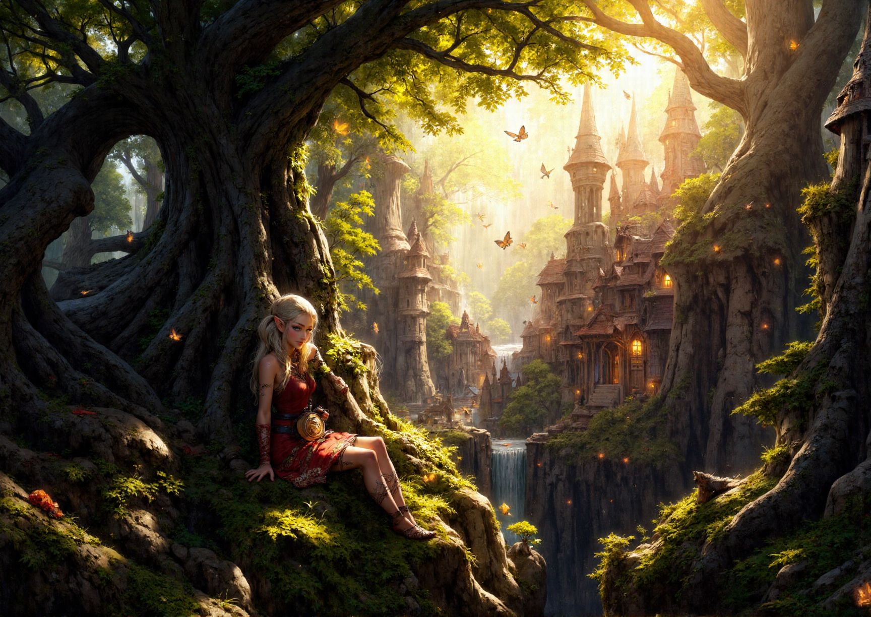 Detailed oil painting. A realistic elf town and its inhabitants in a mystical forest at dawn, with soft rays of sunlight filtering through the dense canopy, illuminating the vibrant foliage and buildings. In the foreground a beautiful elven girl with blonde hair sitting on moss-covered stone, she is smiling at the viewer while holding a guitar. Butterflies and birds. Golden mist and golden hue. Intricate detail, masterpiece. mythp0rt. <lora:FluxDFaeTasticDetails:1> <lora:FluxMythP0rtr4itStyle:1>