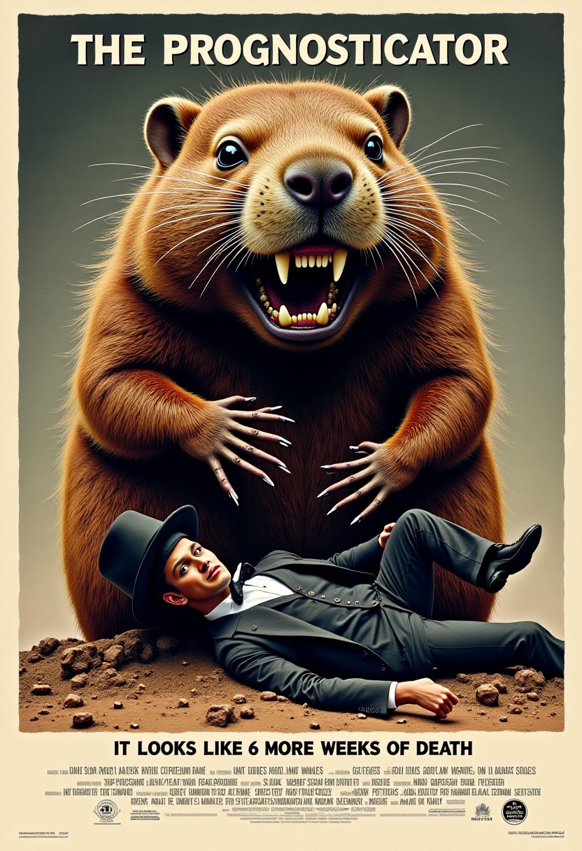 a large Groundhog with shiny, white incisor teeth. A dead man in an old 1800's style suit and top hat lies dead at its paws. TITLE AT TOP: "THE PROGNOSTICATOR". Text below: "IT LOOKS LIKE 6 MORE WEEKS OF DEATH"
