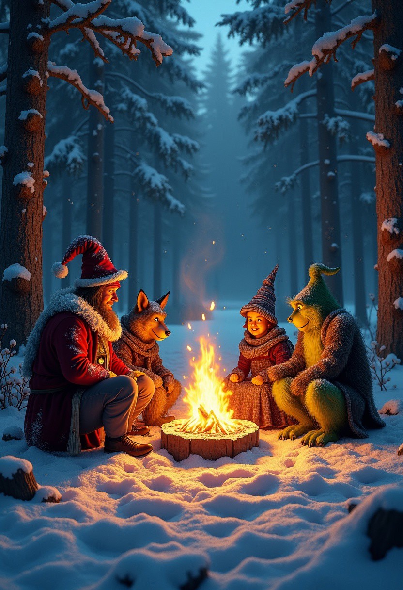 An atmospheric winter woodland setting illuminated by a glowing Christmas campfire. Around the fire sit iconic adversaries from ancient tales: Captain Hook with his hooked hand gleaming, the Big Bad Wolf wrapped in a tattered scarf, the Wicked Witch of the West clutching her crooked broom, and the Grinch eyeing his companions skeptically. Their reflections dance in the snow as the firelight glows warmly, creating shadows among the towering pine trees. The background reveals faint traces of a snow-covered path leading to a mysterious, foggy forest. Intricate details include frost on their clothing, soft falling snow, and the warm, inviting glow of the fire against the cold blues and whites of the wintery landscape.