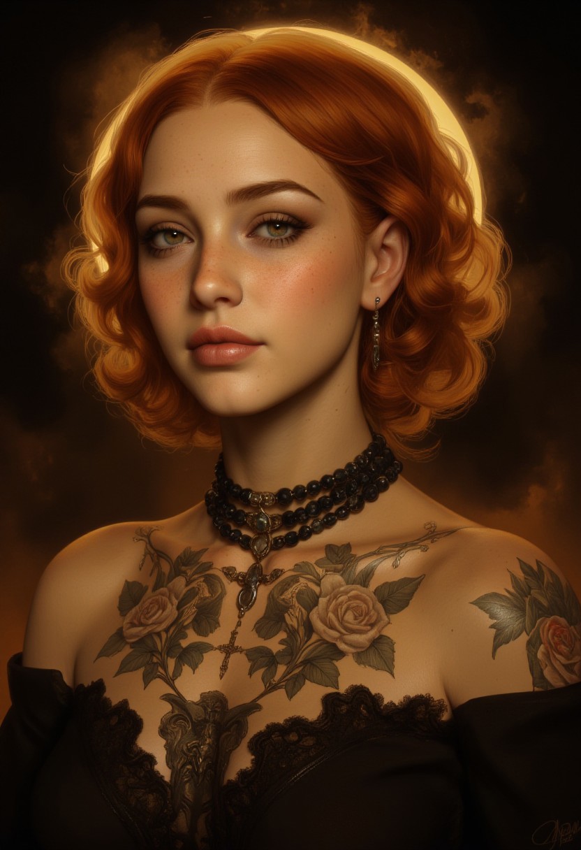 (vintagegirls:1.2) A poised woman with light freckles and cascading red hair, styled in soft curls, adorned with a black beaded necklace and subtle lace attire. Her piercing green eyes are framed by the soft glow of a halo-like light that adds an ethereal touch. She is enveloped in a warm, dark atmosphere with faint swirling mist, creating a dramatic vignette effect. She has tattoos of vines and roses across her shoulders and neck. The subtle interplay of light and shadow accentuates her delicate features and evokes a sense of mystery and elegance.