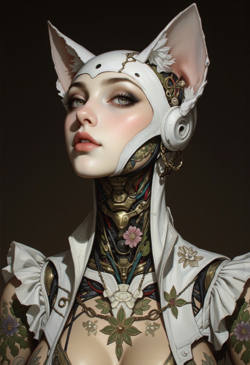 (vintagegirls:1.2) impressionist classical-style painting of a highly detailed, fantasy scene with a dramatic, robotic aesthetic. The central figure is an intricately detailed, hyper-realistic, portrait of a robotic cat skeleton looking up, who is a cracked and broken. Her cat head and body are made of white chrome, shiny and smooth metal with multi-colored, exposed wiring going down her neck creating an organic mosaic pattern on the robotic cat skeleton. A prominent crack with a hole adorns her forehead, adding an eerie aura to her visage. Her long and large cat eyes resemble deep voids that seem to hold ancient secrets. She is set against an eerie backdrop of aged and ancient technology. Her ornate, futuristic catsuit is adorned with delicate wiring and hand-crafted paper flowers, their petals unfolding like tiny, intricate sculptures torn and weathered by time. The overall impression is one of dramatic beauty, with an almost otherworldly quality. (((ultra-realistic style))), realistic soft lighting, dark, eye-catching, atmospheric lighting, natural, shallow depth of field, (highlights: 0.8), high detail (dynamic, cinematic shot, film grain, bokeh, depth of field,)