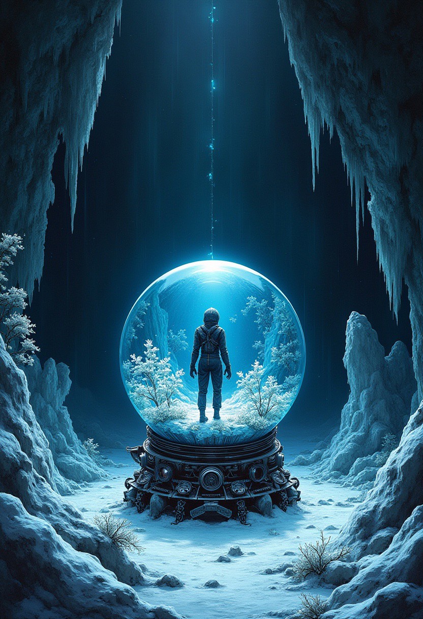 artistic, portrait, synthetic snow globe mechanic, complexity with details, empty eye, ice cave, snowy flowers, limited colors are black and blue, dystopia atmosphere, tsutomu nihei, many details, stylize