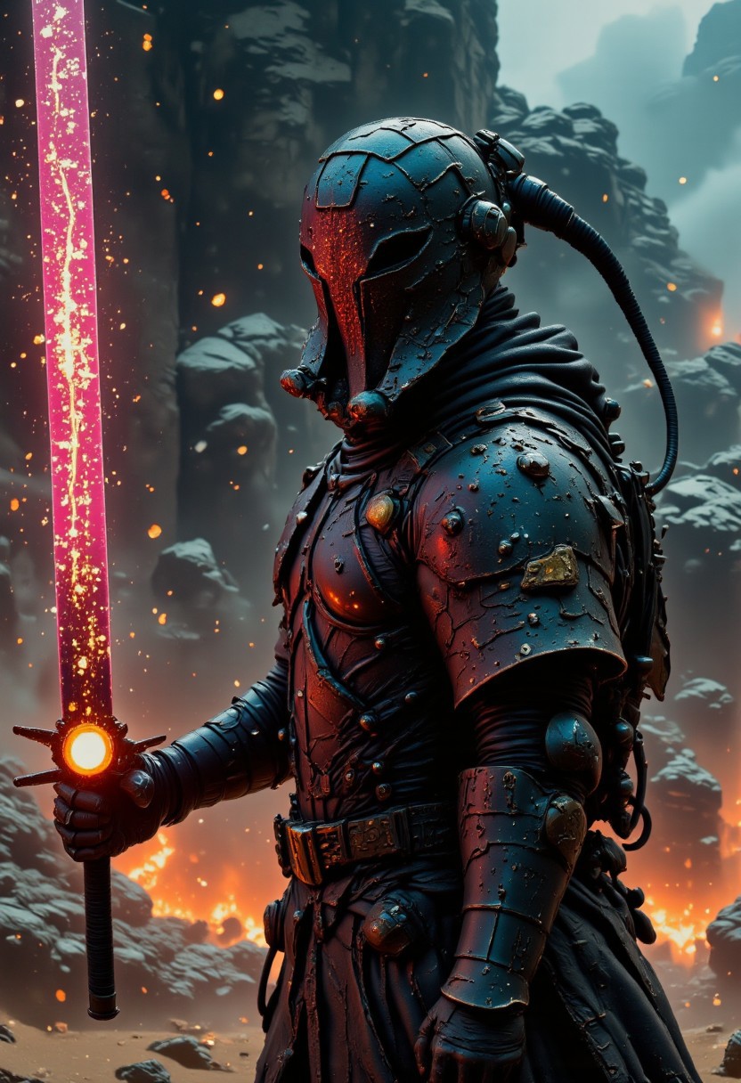 Evil Extreme helmet Closeup of a Action Scene shot of a dark, menacing towering mechanical hkstyle knight in the heat of an intense, action-packed battle, captured with the gritty realism of an old analog camera. The hkstyle knight's intricately designed, battle-worn helmet reflects the eerie magical, ethereal glow of his weapon—a massive, twisted sword. The blade crackles with dark energy, gathering ominously at its tip, where a glowing orb of dark pink-blue and translucent Amber light pulses with immense, destructive power. The energy radiates along the length of the blade, casting a sinister glow that illuminates the knight’s helmet and armor, creating stark contrasts between light and deep shadows. In his other hand, the knight wields a terrifying shield, adorned with jagged, twisted patterns and a ghastly visage that seems to stare into the souls of his enemies. The shield emanates a sense of foreboding, as if cursed by dark magic, adding to the overall terror of his presence. The glow from the sword throws the intricate details of the shield into sharp relief, casting long shadows that flicker across the Lone Desert scenery battlefield amidst dunes