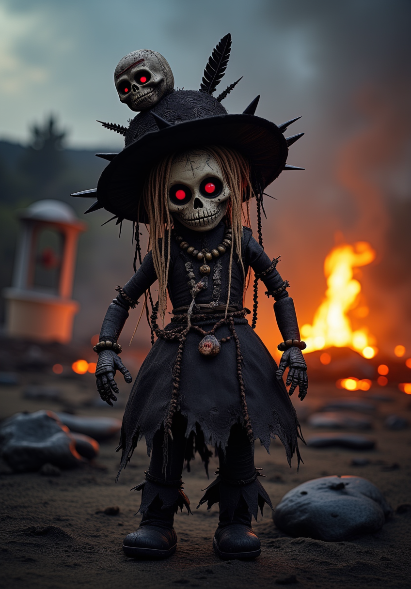 zenthros. A dark, spooky doll stands tall with glowing red eyes. Its head is topped with a smaller skull doll, and its body is adorned with beads and creepy details like spikes and rotting fabric. The backdrop is a charred, burnt landscape, creating an eerie, ominous atmosphere.