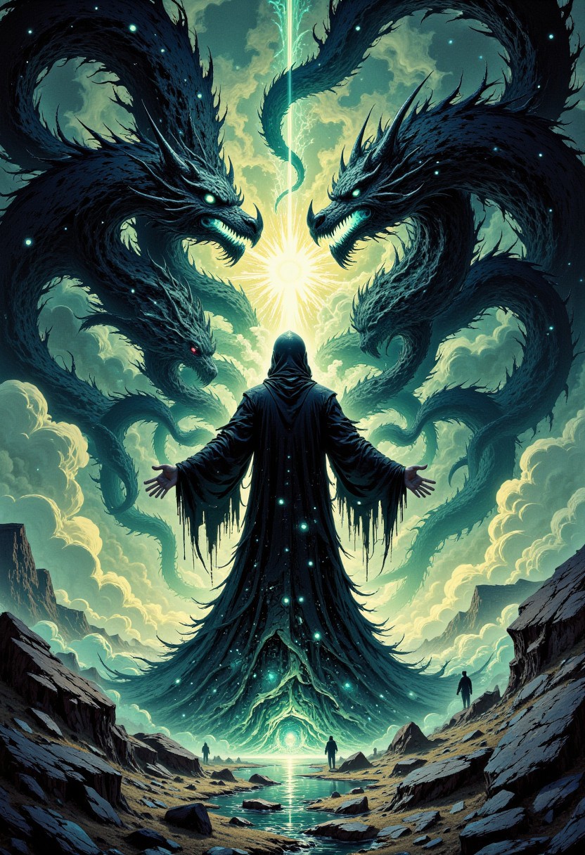 A cloaked figure looms in a vast, surreal landscape, its dark robes seemingly woven from the fabric of the cosmos itself, revealing glimpses of swirling galaxies and shimmering stardust. The figure’s outstretched arms radiate an aura of enigmatic power, embodying the paradox of existence and nonexistence. Surrounding them is an unfathomable realm where ancient shadows writhe, remnants of a forgotten age. In the distance, a black dragon with seven heads coils ominously, its scales glinting like obsidian in the pale, eerie light. Beyond, a gateway without form or frame pulses with ethereal energy, marking the boundary of limitless creation and destruction. Light and shadow intertwine seamlessly, creating a haunting visual symphony that blurs the lines of reality. Rendered in exquisite detail, the scene captures the grandeur of mythic proportions: the betrayal of the ancient order, the foreboding presence of the dragon king, and the birth of a new cosmos. This masterpiece blends the sensual intensity of Vallejo’s art with the dynamic precision of anime semi-realism, immersing viewers in an epic tale of cosmic horror and boundless imagination.