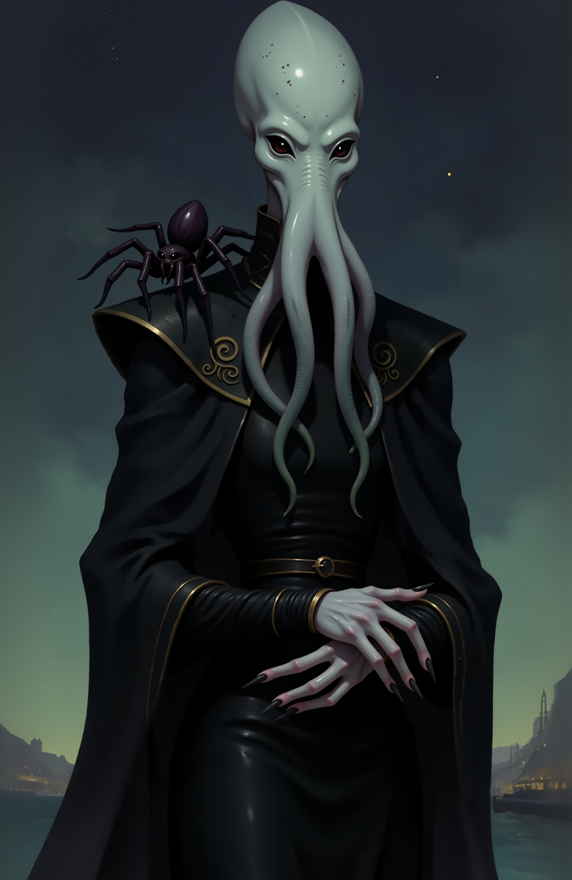 <lora:mindflayers-lora:0.7>, <lora:orithis-vale-style:0.6>, an illithid with pale bluish skin with freckles and (void black eyes), wearing a black shawl with silver details. The big spider sits on their shoulder. Alien stand against the background of a night port in a fantasy setting in natural but also regal pose and their head is slightly tilted in a delicate gesture, 0r1t1s