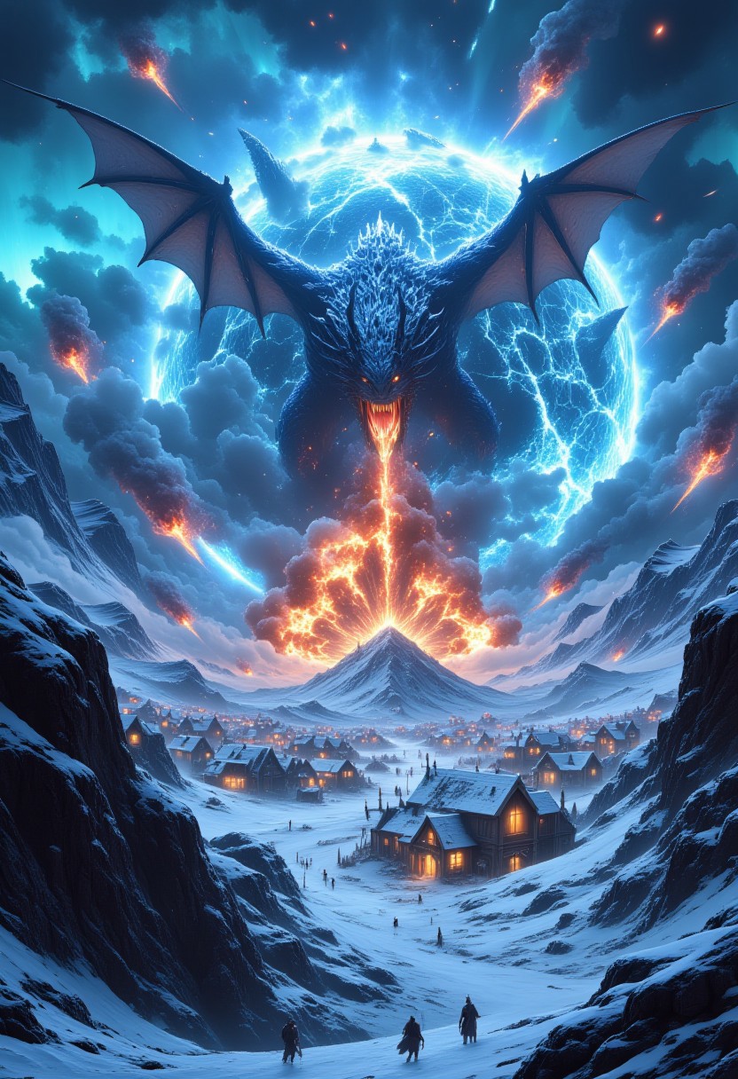 A chaotic ice world under siege, with jagged glaciers shattering as a massive ice dragon unleashes a torrent of frost breath on a horde of fiery invaders. The colossal dragon, glowing with icy runes, towers over a village of glowing ice domes, its wings creating blizzards with each beat. Villagers armed with ice-forged weapons fight alongside the dragon, while fiery meteors rain down, melting ice and causing explosive steam eruptions. The sky blazes with auroras clashing against the invaders' fire, as the dragon roars, shattering the battlefield with raw, freezing power.